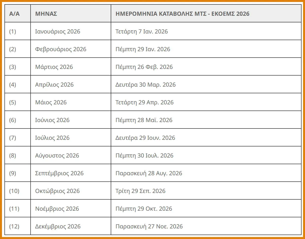 Ημερομηνίες Καταβολής Μερίσματος ΜΤΣ και Οικονομικής Ενίσχυσης ΕΚΟΕΜΣ έτους 2026: