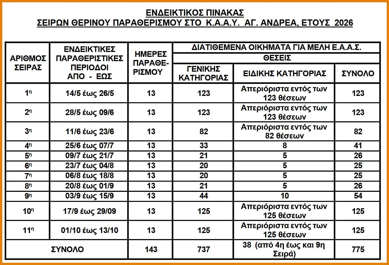 Ενημερώνονται τα Μέλη της Ε.Α.Α.Σ. ότι ο θερινός παραθερισμός έτους 2026, στο ΚΑΑΥ ΑΓ. ΑΝΔΡΕΑ, αναμένεται να πραγματοποιηθεί στις ενδεικτικές Παραθεριστικές Περιόδους που φαίνονται στον παρακάτω Πίνακα. Οι ακριβείς ημερομηνίες των περιόδων θα γνωστοποιηθούν μόλις εκδοθεί η διαταγή του ΓΕΣ για το έτος 2026 τόσο μέσω της ιστοσελίδας της ΕΑΑΣ (www.eaas.gr) όσο και μέσω της εφημερίδας μας ‘’Εθνική Ηχώ’’. Συνεπώς η παρούσα υπέχει θέσεως προϊδεασμού των Μελών μας ώστε να επιταχυνθεί η όλη διαδικασία και να δοθεί χρόνος στους δικαιούχους να προγραμματίσουν τη διαμονή τους κατάλληλα.